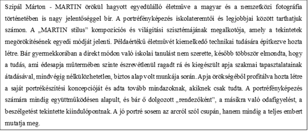 Tisztában vagyok vele, hogy Szipál Márton élete sokkal érdekesebb és szórakoztatóbb a saját nagy svádájú, lenyűgöző előadásában, aminek lendülete elsöpri a kételyeket – s ha lehet egy hősünk, nem biztos, hogy szükségünk van az igazságra. Mindezt azért írtam le, hogy ha kinevettük magunkat, megnézhessük valahol, hogy is volt pontosabban. Szipál életműve, csakúgy, mint édesapjáé, immár a fotótörténet része, ezért talán megérdemelné, s legméltóbbak akkor lennénk örökségéhez, ha annak feldolgozásakor legalább olyan precízek és alaposak lennénk, mint ő.