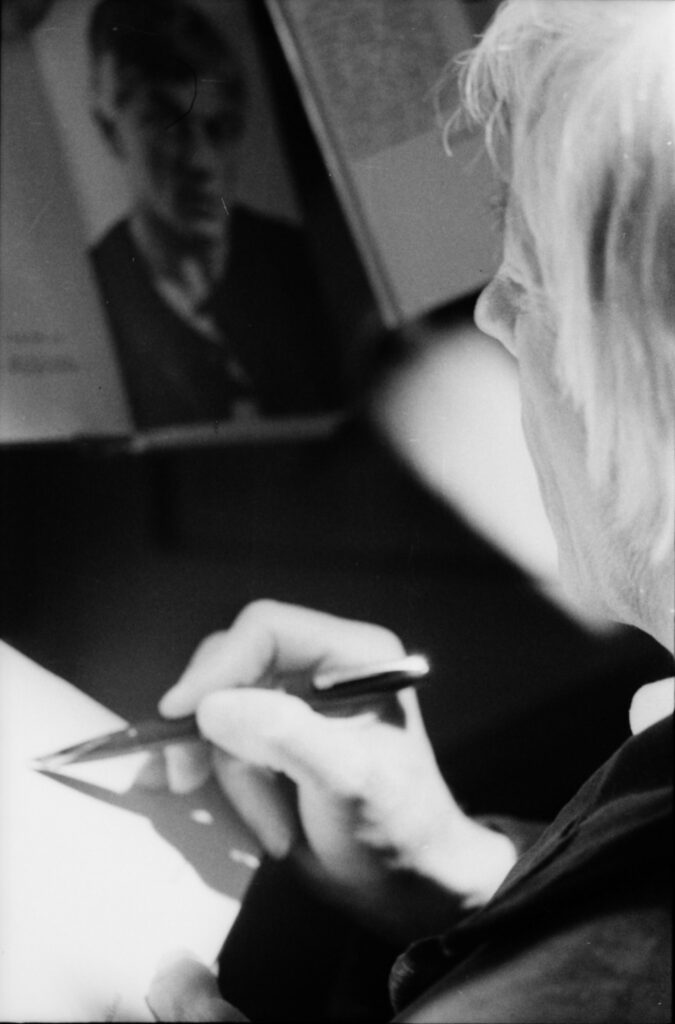Nagy László dedikál, a könyvben Balla Demeter róla készített portréja