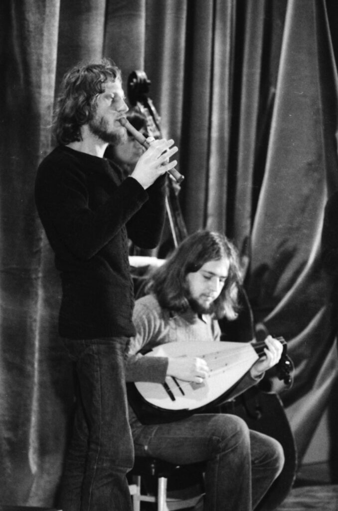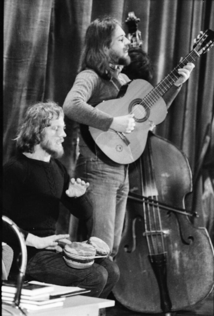 A Vízöntő együttes három tagja (Cserepes Károly, Kiss Ferenc, Zsákay Győző) előadás közben a Déri Múzeum színpadán