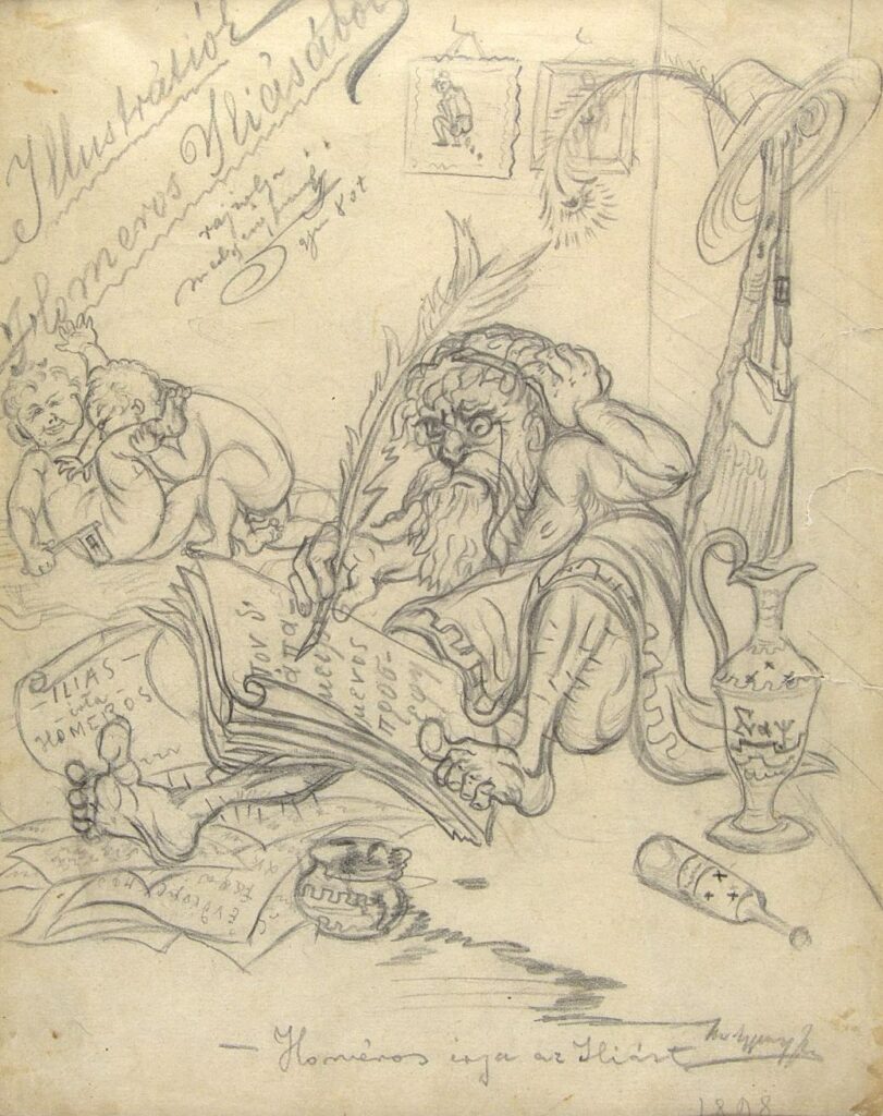 „Gimnáziumban az órák alatt többet firkáltam, mint figyeltem… Ovidiust és Homéroszt illusztráltam, torzképekkel … Sokat rajzolgattam, és örültem, hogy fejlődik ez a képességem. Egész természetesnek találtam, hogy én tudok a legjobban rajzolni rajztanáromat is beleértve (Bosznait) ez volt a meggyőződésem, épp ezért nem is jártam semmiféle rajzórára …maradtam tovább pad alatt rajzolónak.”